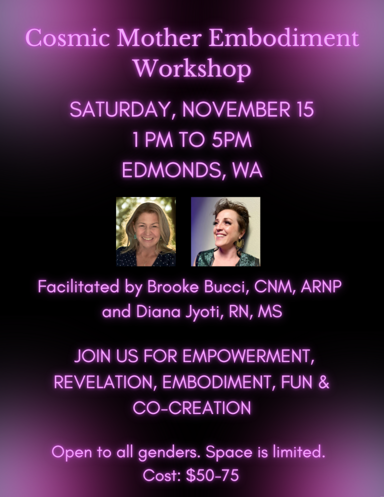 Join those called to ReBirth the Ancient Wisdom of the Divine Feminine in Sacred Women’s Circle. Held monthly in person on the Friday near the phase of the Full Moon from 7 pm – 930 pm at The Temple of Light Sanctuary in Edmonds, WA. This Circle is for Sacred Sharing, Sacred Teachings, and Sacred Support. Each circle will minimally include a shamanic journey offered by Brooke, a sharing circle, chanting, toning, music, and/or drumming, and teachings on the Sacred Feminine. The circle is facilitated by Brooke Bucci, CNM, but is a co-creative ceremony with all present. The circle is open to anyone who identifies as a woman.